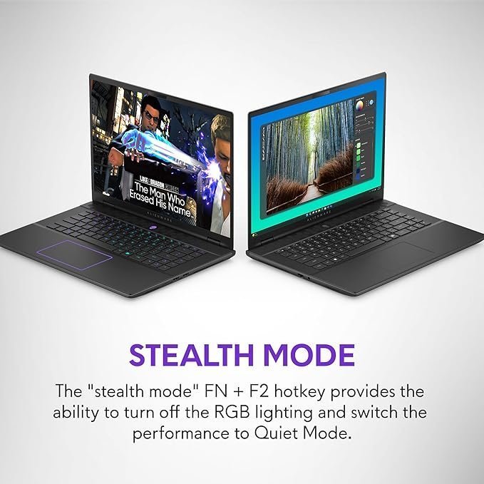 • Display: 16″ QHD+ 240Hz, 100% sRGB, ComfortView Plus, NVIDIA G-SYNC + Advanced Optimus // Graphics: NVIDIA GeForce RTX 4070, 8 GB GDDR6 // Keyboard: English US AlienFX RGB backlit (per-key) Alienware M Series keyboard