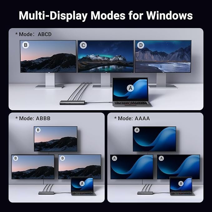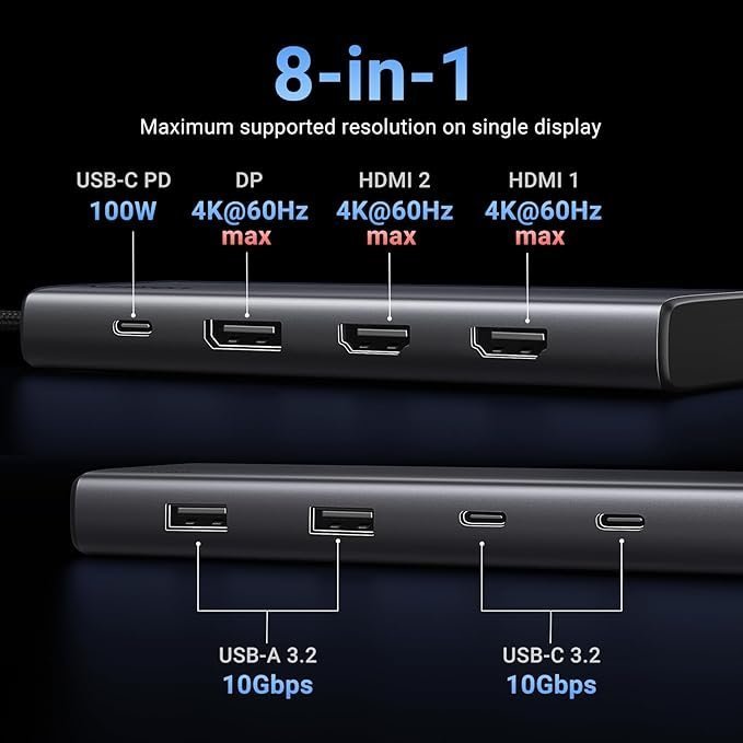 - 8 in 1 USB C Laptop Docking Station: Ugreen triple docking station is equipped with two 4K HDMI ports, a 4K DisplayPort, two 10 Gbps USB-C 3.2 Gen 2 ports, two 10 Gbps USB-A 3.2 Gen 2 ports, and 100W Power Delivery.